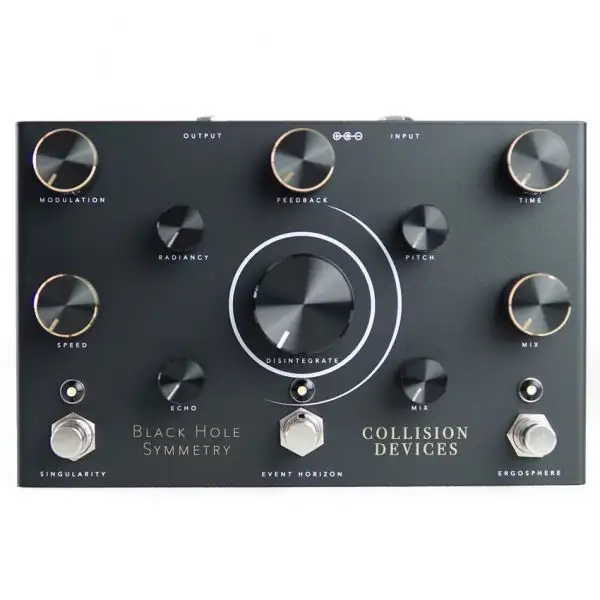 The Collision Devices Black Hole Symmetry is a modulated delay/pitch-shifted reverb/destruction fuzz pedal allowing you to create warm waves & trembling repetitions, space reverb sounds and of course make a lot of noise by recreating the fury of a black hole. Travel through the ERGOSPHERE, the EVENT HORIZON and the SINGULARITY. The three parts of the pedal which can be played together or separately. Each pedal is designed, assembled & tested by hand in Collision Devices’ workshop in France. The Black Hole Symmetry includes a lifetime warranty.