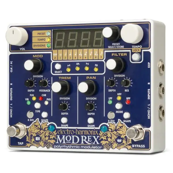 The Electro-Harmonix Mod Rex Polyrhythmic Modulator is a kinetic tour-de-force that lets you weave compelling, shifting, musical tapestries. Whether you are a guitarist, synthesist or electronic musician you will find it inspires your creativity and stretches your musical boundaries.