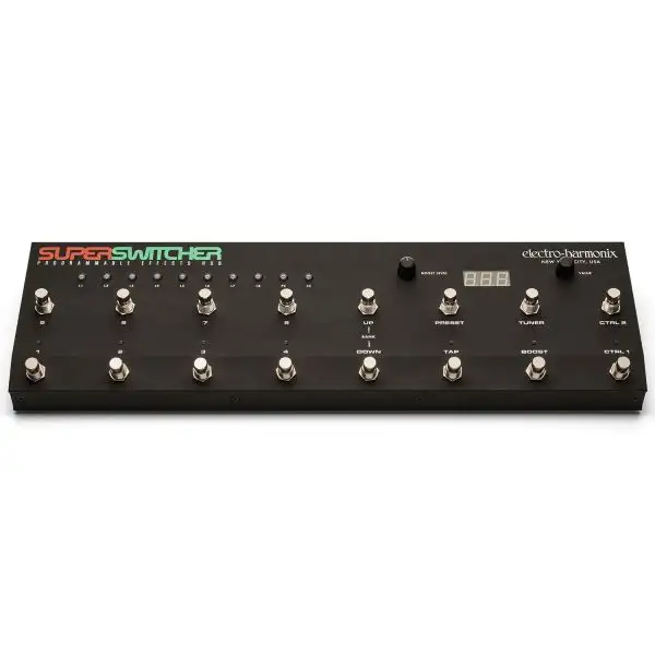 The Electro Harmonix Super Switcher, as its name implies, offers a powerful solution for players who are tired of βtap dancingβ around their pedalboard. In effect, it moves all of your pedals to your pedalboardβs front row while delivering control of them with one button push. The result is that it puts the player back in control of an unruly pedalboard!