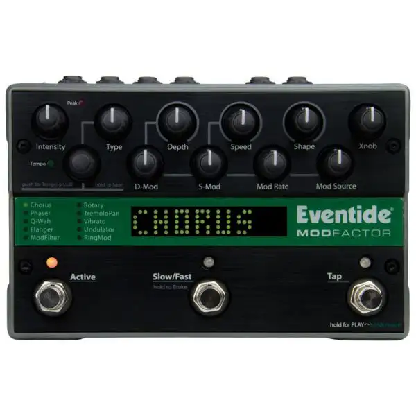 The Eventide Modfactor gives you all the standards – Chorus, Flanger, Phaser as well as Rotary, Tremolo, and Vibrato are there. Also included is the unique Undulator effect from the H8000 and a RingMod that lands somewhere between ring modulation and synthesis. The dedicated SLOW/FAST footswitch for ramping the LFO rate comes in handy. LFO rates can also sync to Tap Tempo and MIDI clock