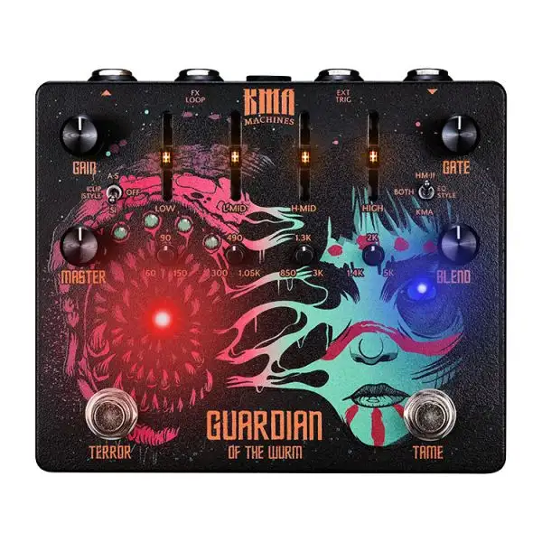 Fusing together the powerful evolution of KMA’s highly regarded WURM Distortion with an intuitive, yet versatile and ultra-fast Noise Gate, the KMA Machines GUARDIAN of the WURM is the perfect metal monster. From chugging hard-rock, droning doom metal and grinding Swedish death metal, the beast abides. But through its highly tweakable control set, the pedal can be tamed to provide impeccable clarity to your riffs, making this the definitive dirt pedal for metal, prog-rock, shoegaze, indie and beyond.
