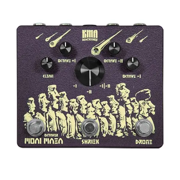 For thousand of years they tower over the green meadows along the coast and the hillside of Rapa Nui. Moai Maea, silent and solemn – venerated and mystified by a long forgotten ancient culture. It will let you feel the droning and shrieking of the mighty erupting Rano Raraku where the Moai Maea was born. The KMA Machines Moai Maea is the answer to long forgotten analog octaver tones. The pedal generates one higher octave and up to two sub-octaves, helping you generate a huge wall of sound by playing just one note. The higher octave has an edgy and fuzzy character which is reminiscent of old late โ60s early โ70s octave-up tones, as used by legends like Hendrix or The Stooges. The sub-octaves turn your guitar into a filthy bass guitar with ground shaking lows. Choose between either the first (-I), the second (-II) or both together (-I/-II), which gives you the sought-after wall of sound.