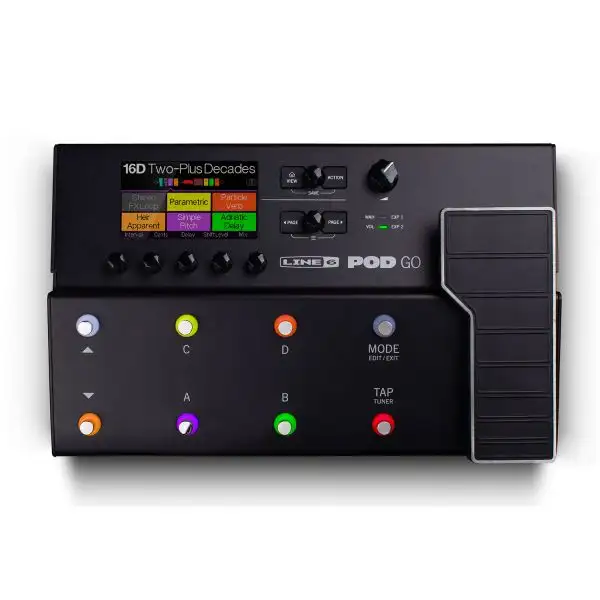 POD Go enables a simple and intuitive workflow. Choose, edit, and control sounds using the large color LCD screen, five push encoders, eight rugged footswitches, and cast-aluminum multi-function expression pedalβand add two external footswitches or a second expression pedal for even more real-time control. All the essential audio connections are at your fingertips, too, including balanced stereo outputs, a duplicate amp out that can be tapped before the Cab/IR, a stereo effects loop, a headphone jack, and even a USB port for accessing the 4-in/4-out audio interface with re-amping.