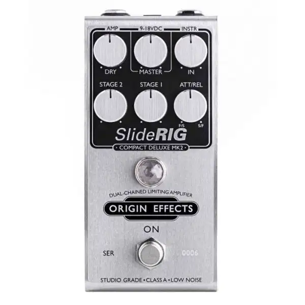 The Origin Effects SlideRig Compact Deluxe MK2 Compressor Pedal takes the awesome dual-chained compression and limitless clean sustain of its predecessor and adds continuously adjustable control over attack and release times. Every version of the SlideRIG up until now has featured fixed attack and release characteristics. And for good reason β with this much compression on tap, thereβs plenty of potential for undesirable results. But with the SlideRIG Compact Deluxe MK2, Origin have succeeded in designing a single control that lets you explore a wide range of attack and release settings while avoiding any unpleasant distortion artifacts. This simple control gives you the freedom to shape the transient of each note, from smooth, uniform sustain to a spiky and percussive pick attack.