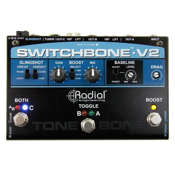 In play, the Switchbone V2 elevates your setup with a variable Baselineβ’ buffer control that lets you juice up the front end of your amp for extra punch. A built-in power booster at the output delivers up to +18db of ultra-clean boost with the option to add mid-boost for extra sustain when playing lead. The Boost footswitch may also be reassigned to a tuner output for quiet on stage adjustments. To add even more control to your performance, the Slingshotβ’ remote control output can be used to turn on effects, change speakers when combined with the Toneboneβ’ Cabboneβ’ or even reroute effects using the Twinlineβ’.