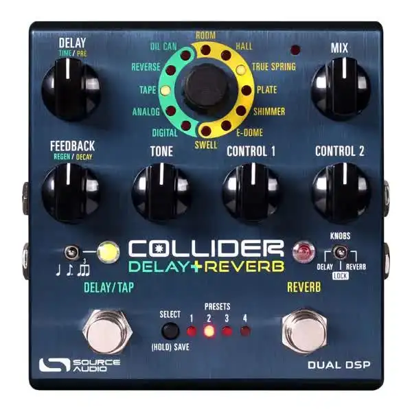 The Collider offers an exceptional collection of rich, spacious tones, including realistic reproductions of vintage Analog, Tape, and Oil Can Delays, classic models of Spring and Plate Reverb, natural replications of large and small acoustic spaces, and an intriguing and highly musical selection of โunnaturalโ tones including a tripped-out Reverse Delay and an other-worldly Shimmer Reverb.