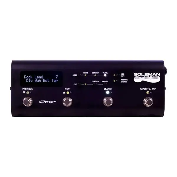 - Four Footswitches—Use the footswitches to scroll through presets (ie “scenes”), launch individual MIDI messages, step through set lists, or trigger highly customizable MIDI macros. Configure footswitch functionality with any of the Soleman’s three useful control modes.