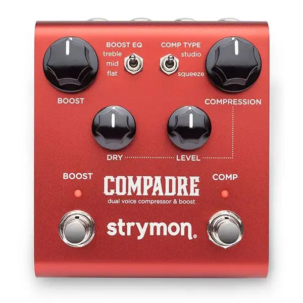 Start your signal chain with the best possible version of your guitar tone. Treat your guitar signal to true studio quality analog compression with the Strymon Compadre Dual Voice Compressor and Boost Pedal featuring two distinct voices for smooth transparency or vintage squeeze. Hit the Boost switch to add clean boost or soft-clipped dirty boost, with the EQ curve of your choice. Feel the perfectly tailored dynamic response, feeding your amp and effects just what they need to sound their best.