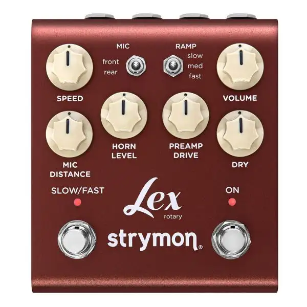 The goal with Lex was to create the most realistic sounding, flexible rotating speaker effect ever fit within a pedal. As part of that, Lex features a full suite of practical controls to help you shape your rotary tone to your heart’s content. A major part of that is Lex’s dedicated Horn Level control, which adjusts the output level of the high frequency rotating horn. Turn it up for added output that will help your rotating effect cut through the mix, or dial things back to mellow out Lex’s higher frequencies. For this new generation of Lex, Strymon have added a Dry mix control, which allows you to add more dry mix to your signal for a cleaner, clearer tone — or go full wet, and truly immerse your signal in rotating speaker goodness. For added flexibility, they have also included a Volume knob for control over Lex’s significant +/-6dB boost/cut — perfect for dialing in the best level for a live or studio mix.
