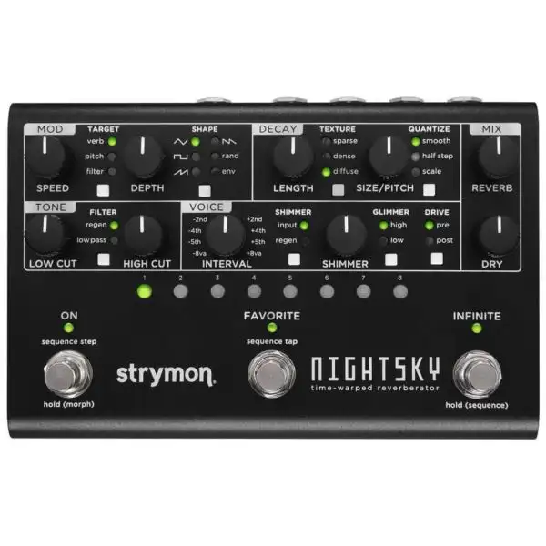 NightSky is a reverberant synthesis workstation, and a powerful, hands-on experimental sound design platform. NightSky gives you real-time continuous control of reverb pitch/processing rate/core size, harmonics, and even a synth-like resonant filter with multiple modulation waveshapes, plus a step sequencer with variable glide. You havenβt heard a pedal like this before.