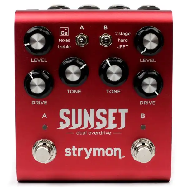 The Strymon Sunset gives you the best of the best classic overdrive circuits, custom voiced for instantly gratifying control over a huge range of sought-after tones. Strymon studied six circuit types found in many truly timeless and iconic overdrive and boost pedals, and put their takes on all six of them into a single two-channel unit.