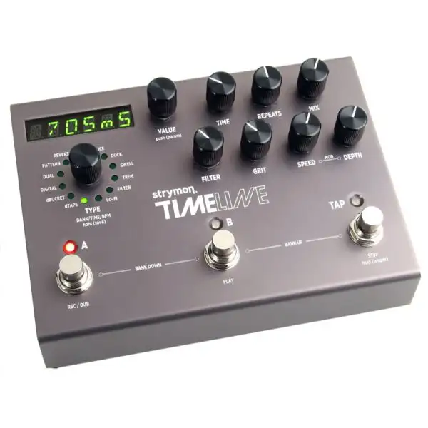 - Seven front-panel tone shaping knobs: Time, Repeats, Mix, Filter, Grit, Mod Speed, Mod Depth