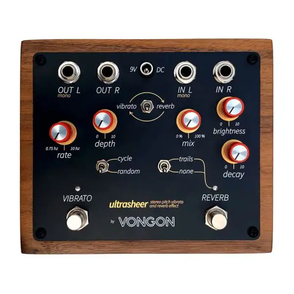 The Vongon Ultrasheer Stereo Reverb and Vibrato Pedal is a stereo reverb and vibrato combination inspired by the early digital studio effects units of the late 1970s, capable of moving you from a lush warbled space to a shallow room through an intuitive and satisfyingly tactile interface.